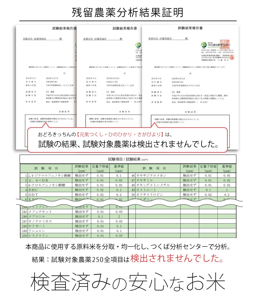 本商品に使用するヒノヒカリを分取・均一化し、つくば分析センターで分析。結果:試験対象農薬250全項目は検出されませんでした。