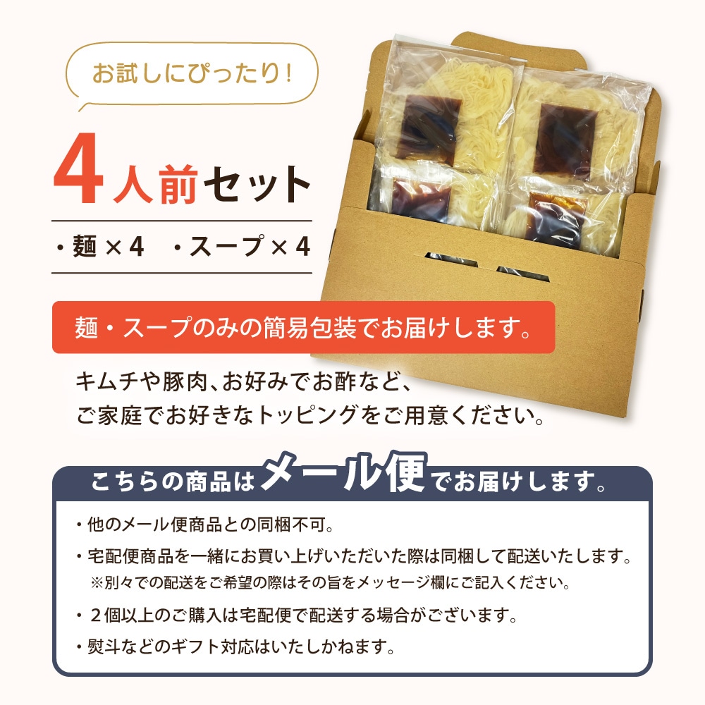 ・お試しし易い4食セットはメール便送料無料でお届けしております できるだけお得な価格でご提供できるように包装はとてもシンプルです。メール便(送料無料)にてお届けいたします。宅配便配送で配送日指定も行える、大容量の10人前セットと15人前セットも別途ご用意いたしております。