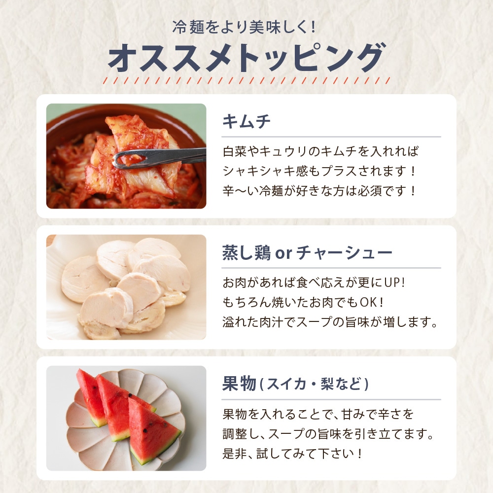 ・いろんなアレンジやレシピで自分好みの冷麺をお楽しみください お好きな具材(きゅうり、ゆで卵、トマト、キムチ、大根キムチ、もやし、ナムル、牛肉、骨付きカルビ、豚バラ、コチュジャン、ハムなど)を加えてお気に入りレシピをぜひ見つけて下さい。すだちやレモンをトッピングして爽やかな香りと風味の納涼冷麺も夏のランチにオススメです。冷やし中華や冷やしラーメンに飽きたら本格冷麺をどうぞお試しください。