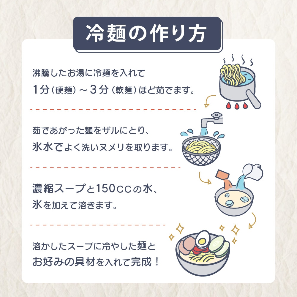 つるつる、しこしこの強烈なコシの冷麺と極旨絶品スープ 特製の生麺は沸騰したお湯で2分〜3分茹で氷水で洗うだけで強烈なコシと弾力の冷麺に仕上がります。また、濃縮タイプのスープは150ccの水で薄めるだけで、あっさりですが出汁の旨味が凝縮された絶品スープが完成。ほのかな酸味と辛味が食欲をそそり、夏の暑い時季でもさっぱりとお召あがり頂けます。